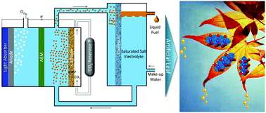 Abstract: Artificial photosynthesis of liquid fuels is a potential source for clean energy. Alcohols are particularly attractive products because of their high energy density and market value per amount of energy input. The major challenges in photo/electrochemical synthesis of alcohols from sunlight, water and CO2 are low product selectivity, high membrane fuel-crossover losses, and high cost of product separation from the electrolyte. Here we propose an artificial photosynthesis scheme for direct synthesis and separation to almost pure ethanol with minimum product crossover using saturated salt electrolytes. The ethanol produced in the saturated salt electrolytes can be readily phase separated into a microemulsion, which can be collected as pure products in a liquid–liquid extractor. A novel design of an integrated artificial photosynthetic system is proposed that continuously produces >90 wt% pure ethanol using a polycrystalline copper cathode at a current density of 0.85 mA cm−2. The annual production rate of >90 wt% ethanol using such a photosynthesis system operating at 10 mA cm−2 (12% solar-to-fuel (STF) efficiency) can be 15.27 million gallons per year per square kilometer, which corresponds to 7% of the industrial ethanol production capacity of California.